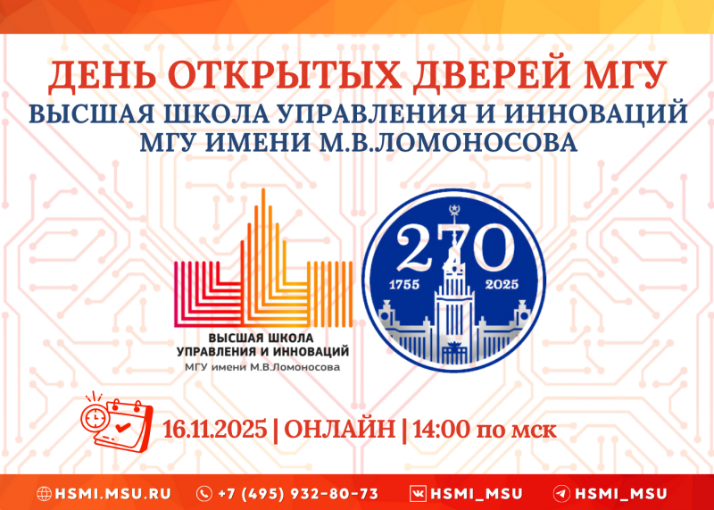 16 ноября 2025 года в рамках Дня открытых дверей МГУ состоится День открытых дверей Высшей школы управления и инноваций МГУ имени М.В.Ломоносова для абитуриентовв дистанционном (онлайн) формате.